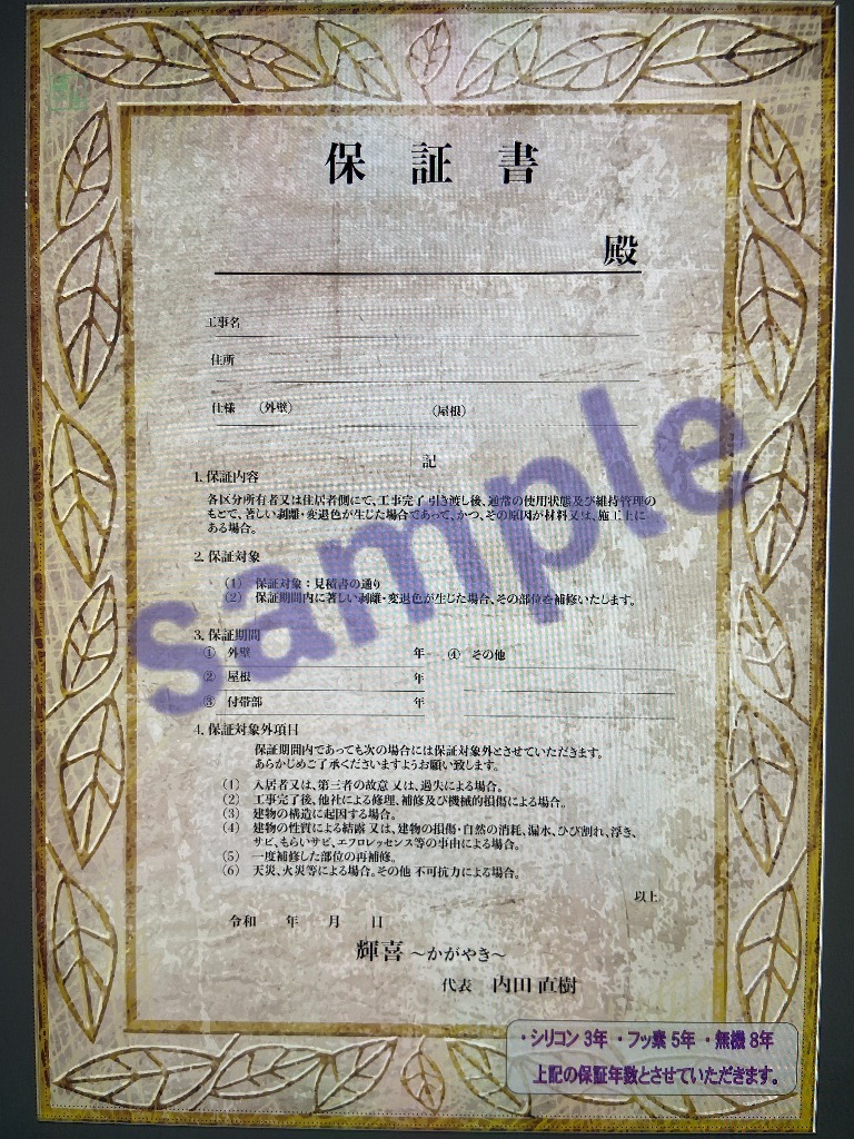 『輝喜〜かがやき〜』の立ち上げまで 安心の保証書発行 自己紹介 『輝喜〜かがやき〜』の立ち上げまで はじめは老舗の塗装屋に勤めており、作業や塗料についての知識を付けました。その後下請けの塗装屋で作業効率を上げるノウハウなどを学んだ後、晴れて自分の塗装屋を立ち上げました。 安心の保証書発行 『輝喜〜かがやき〜』では、保証書の発行を行っております。大手の塗装店でもあまり保証書の発行を行ってるところは少ないです。保証書を発行せず、期待耐久年数や保証年数をごまかす業者も多いので、保証書の発行は「安心」の証。せっかくなら、信頼できるところで施工をしてみませんか? 自己紹介